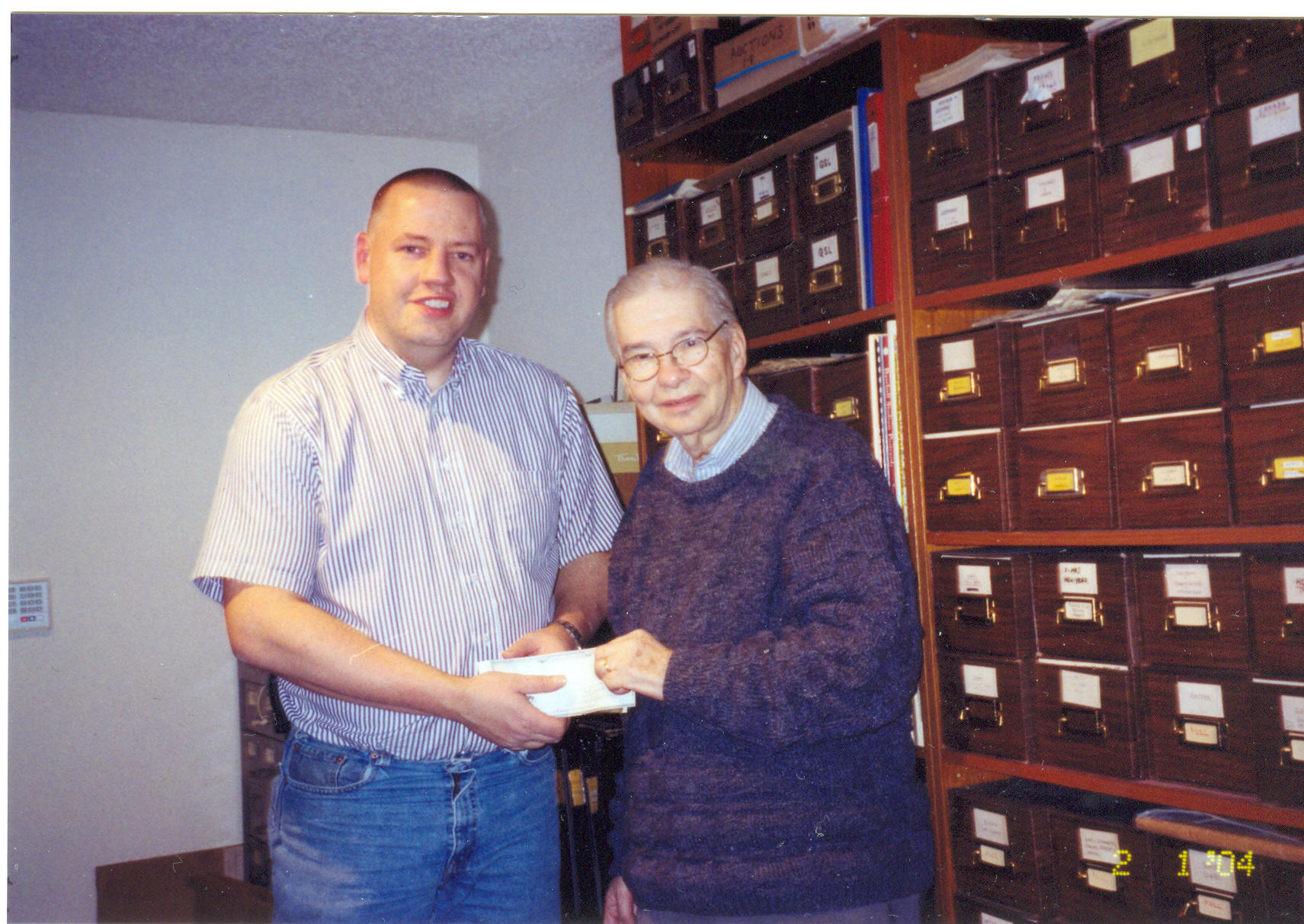 February 1, 2004. Scott Shaulis presents Richard Novick with a cashiers check.